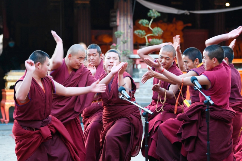 Один из кандидатов на получение степени геше лхарамбы защищает свое понимание буддийских сутр. Фото: Дэньцзинь Сытань / Для China Daily